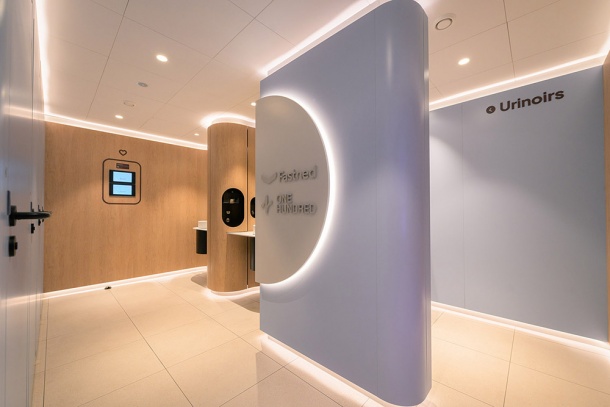 The new concept includes innovative modules such as a mini vending with fresh-up items for travellers, a digital face scan developed with Belgian health tech company IntelliProve2 offering insights into stress levels and overall well-being, ONE HUNDRED's smart urinal that monitors hydration, as well as a shower, baby changing station and accessible toilet facilities.