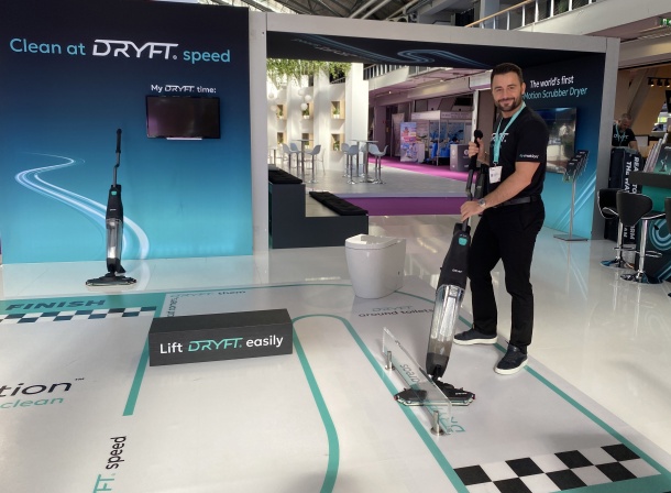 Competitors are expected to clean under the low shelf and around the toilet during the "race" - tasks that are facilitated by the low profile and shape of the Dryft machine.